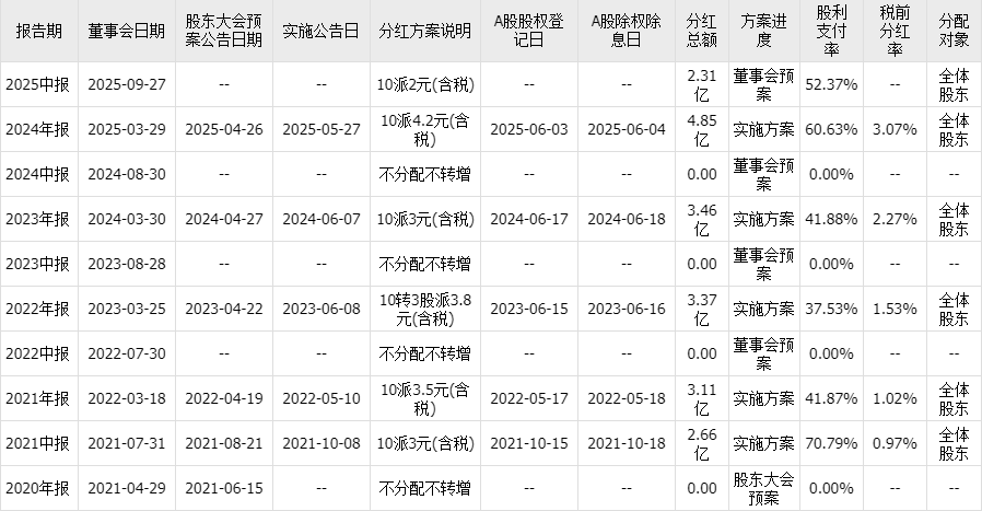 今年三季报公司审议通过了《2025年半年度利润分配预案》,10派2元,分红总额2.31亿,如果叠加年初分红4.85亿,那么2025年共派发红利7.16亿,相当于2024年利润8亿的90%都用于分配。
