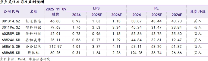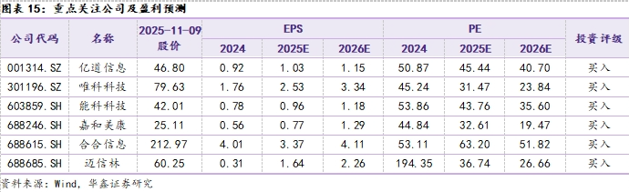 中长期,建议关注临床AI产品成功落地验证的嘉和美康(688246.SH)、已与Rokid等多家知名AI眼镜厂商建立紧密合作的亿道信息(001314.SZ)、加快扩张算力业务的精密零部件龙头迈信林(688685.SH)、新能源业务高增并供货科尔摩根等全球电机巨头的唯科科技(301196.SZ),AI智能文字识别与商业大数据领域巨头的合合信息(688615.SH)、深耕工业AI与软件并长期服务高端装备等领域头部客户的能科科技(603859.SH)。