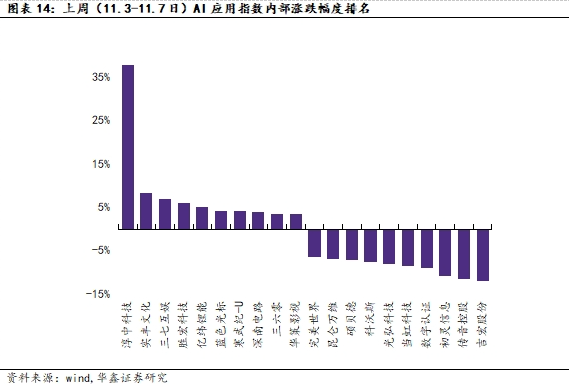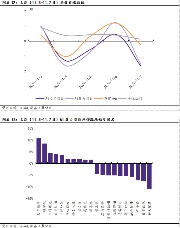本周(11.3-11.7日),AI应用指数/AI算力指数/万得全A/中证红利日涨幅最大值分别为0.98%/1.23%/1.19%/0.90%,AI应用指数/AI算力指数/万得全A/中证红利日跌幅最大值分别为-1.67%/-1.65%/-1.03%/0.12%。AI算力指数内部,天孚通信以+10.75%录得上周最大涨幅,初灵信息以-10.76%录得上周最大跌幅。AI应用指数内部,淳中科技以+37.80%录得上周最大涨幅,吉宏股份以-11.97%录得上周最大跌幅。