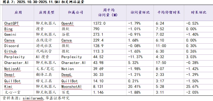 本期(2025.10.30-2025.11.5)AI相关网站流量数据:访问量前三位分别为ChatGPT(1372.0M)、Bing(790.0M)和Gemini(273.1M),访问量环比增速第一为Kimi(20.41%);平均停留时长前三位分别为Character.AI(00:17:50)、Discord(00:11:00)和NotionAI(00:08:07);平均停留时长环比增速第一为Kimi(25.67%)。