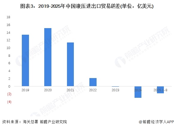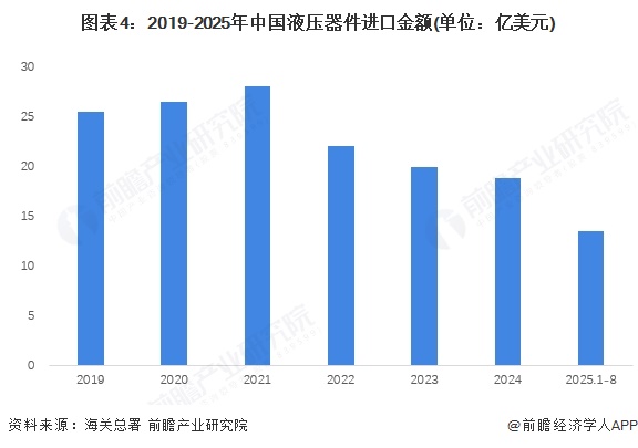 根据海关总署披露数据,从2019-2024年我国液压进口金额来看,我国液压进口金额整体呈下降趋势。2024年我国液压进口金额为18.88亿美元,同比下降5.2%,主要是由于随着国内企业竞争力逐步增强,对国外的液压器件依赖度逐渐下降。2025年1-8月液压进口金额为13.54亿美元。