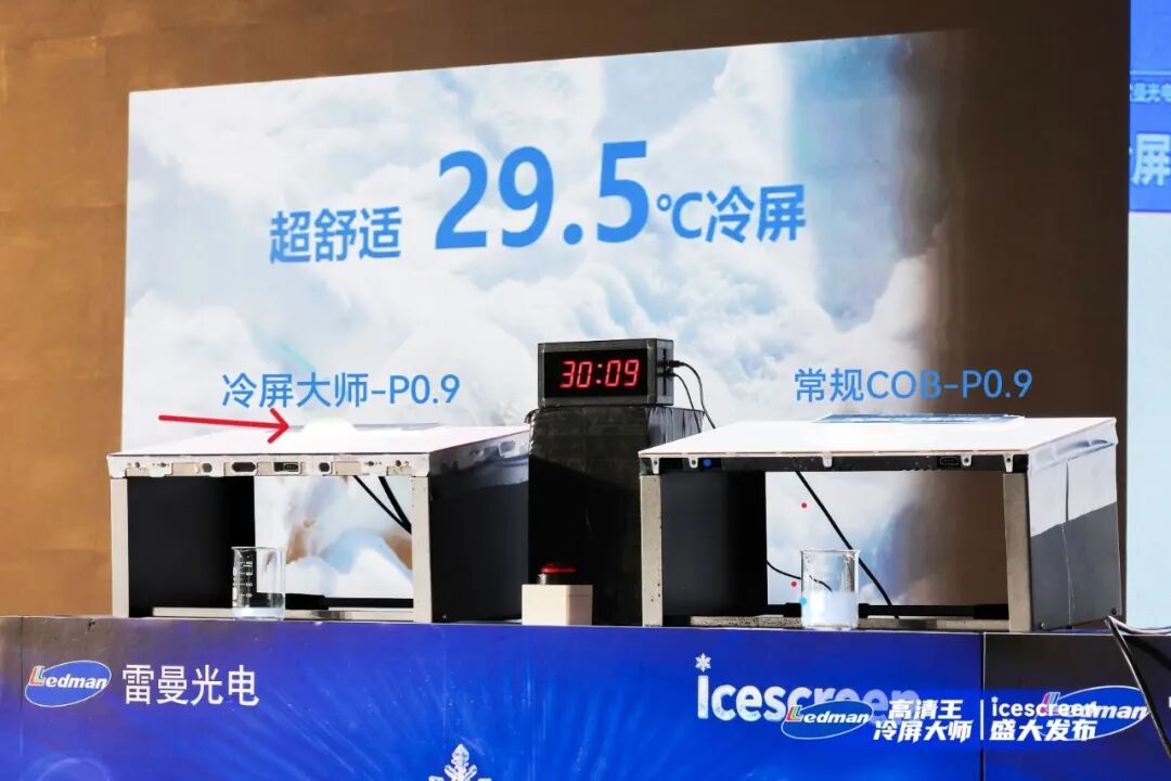 发布会现场,设置了超高清盲测、节能挑战和融冰挑战三项硬核挑PK,将点间距同为0.9mm的“雷曼高清王冷屏大师”与常规COB产品在相同条件下进行性能对比。