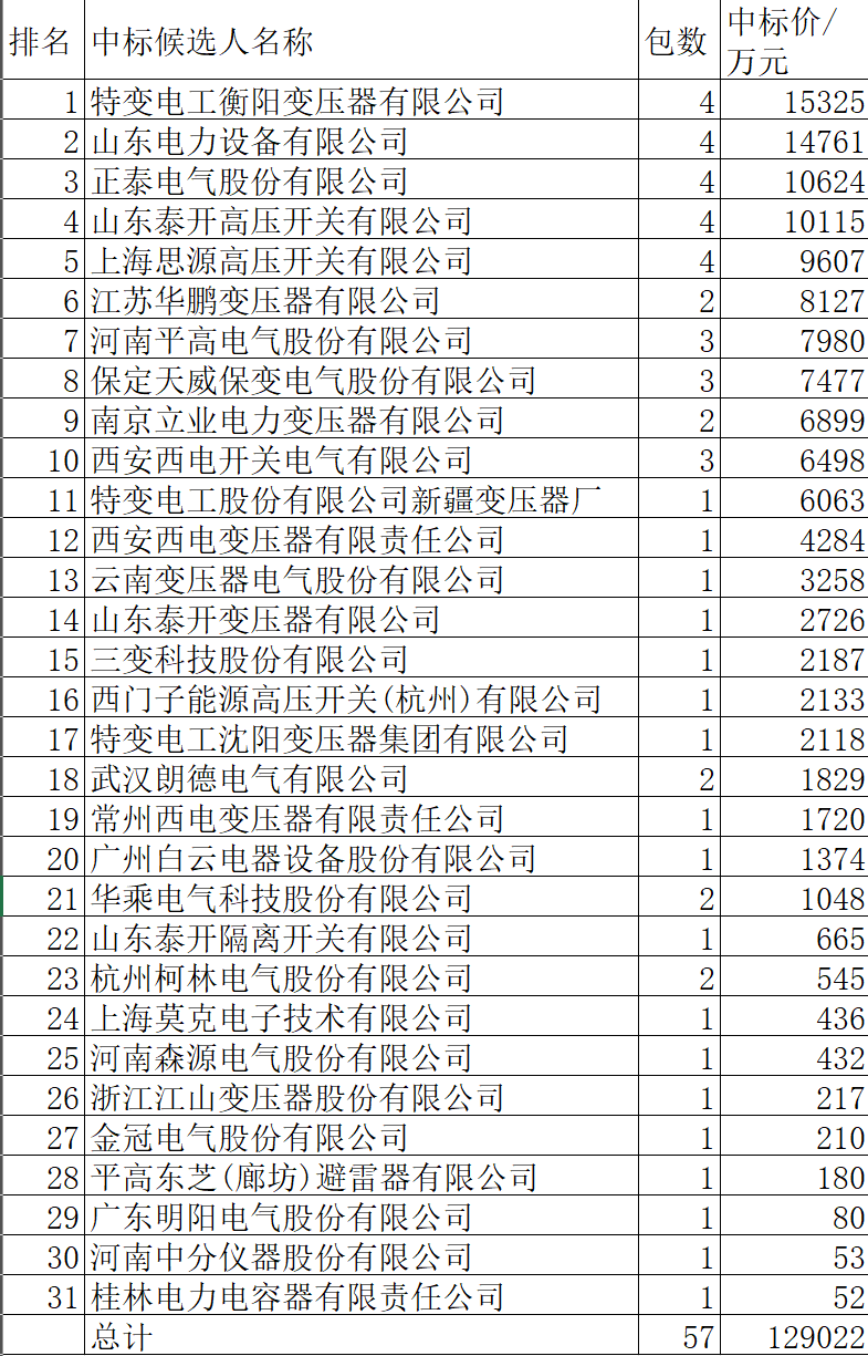 山东泰开隔离开关有限公司、杭州柯林电气股份有限公司、上海莫克电子技术有限公司、河南森源电气股份有限公司、浙江江山变压器股份有限公司、金冠电气股份有限公司、平高东芝(廊坊)避雷器有限公司、广东明阳电气股份有限公司、河南中分仪器股份有限公司、桂林电力电容器有限责任公司10家中标金额在665万元-52万元之间,位居第22-第31之间。