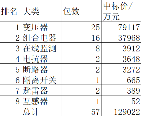 8大类物资中,变压器招25包79117万元,占总金额的61.3%;组合电器招16包37968万元,占总金额的29.4%。在线监测、电抗器、断路器、隔离开关、避雷器、互感器6类物资合计招16包11938万元,占总金额的9.3%。