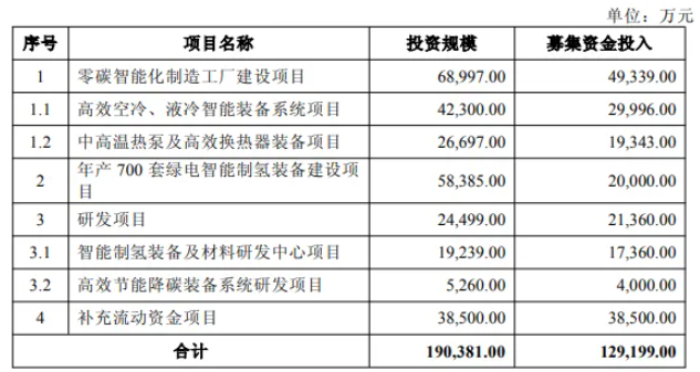 其中特别值得关注的是,在募资的12.9亿元中约有4.14亿元将投向氢能等相关项目,分别是年产700套绿电智能制氢装备建设项目、智能制氢装备及材料研发中心项目以及高效节能降碳装备系统研发项目。