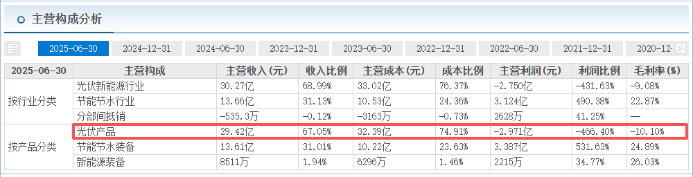 此外通过对比财报数据发现,双良节能的亏损主要源于光伏业务。以最新2025年中报为例,公司报告期内光伏产品主营收入29.42亿元,占总收入的67.05%,但其毛利率却为-10.10%,是公司唯一处于亏损状态的业务。