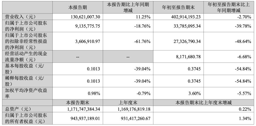 业绩方面,今年前三季度,公司实现营业总收入4.03亿元,同比下降2.70%;归母净利润3378.51万元,同比下降39.78%;扣非净利润2732.68万元,同比下降48.64%;经营活动产生的现金流量净额为817.17万元,同比下降6.68%。
