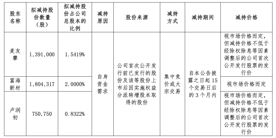 持有公司股份459.2万股(占公司总股本比例5.0900%)的大股东东方富海(芜湖)股权投资基金管理企业(有限合伙)-深圳市富海新材股权投资基金(有限合伙)(简称“富海新材”)计划于公告披露之日起15个交易日后的3个月内,以集中竞价或大宗交易方式减持公司股份不超过180.43万股(占公司总股本比例不超过2%);