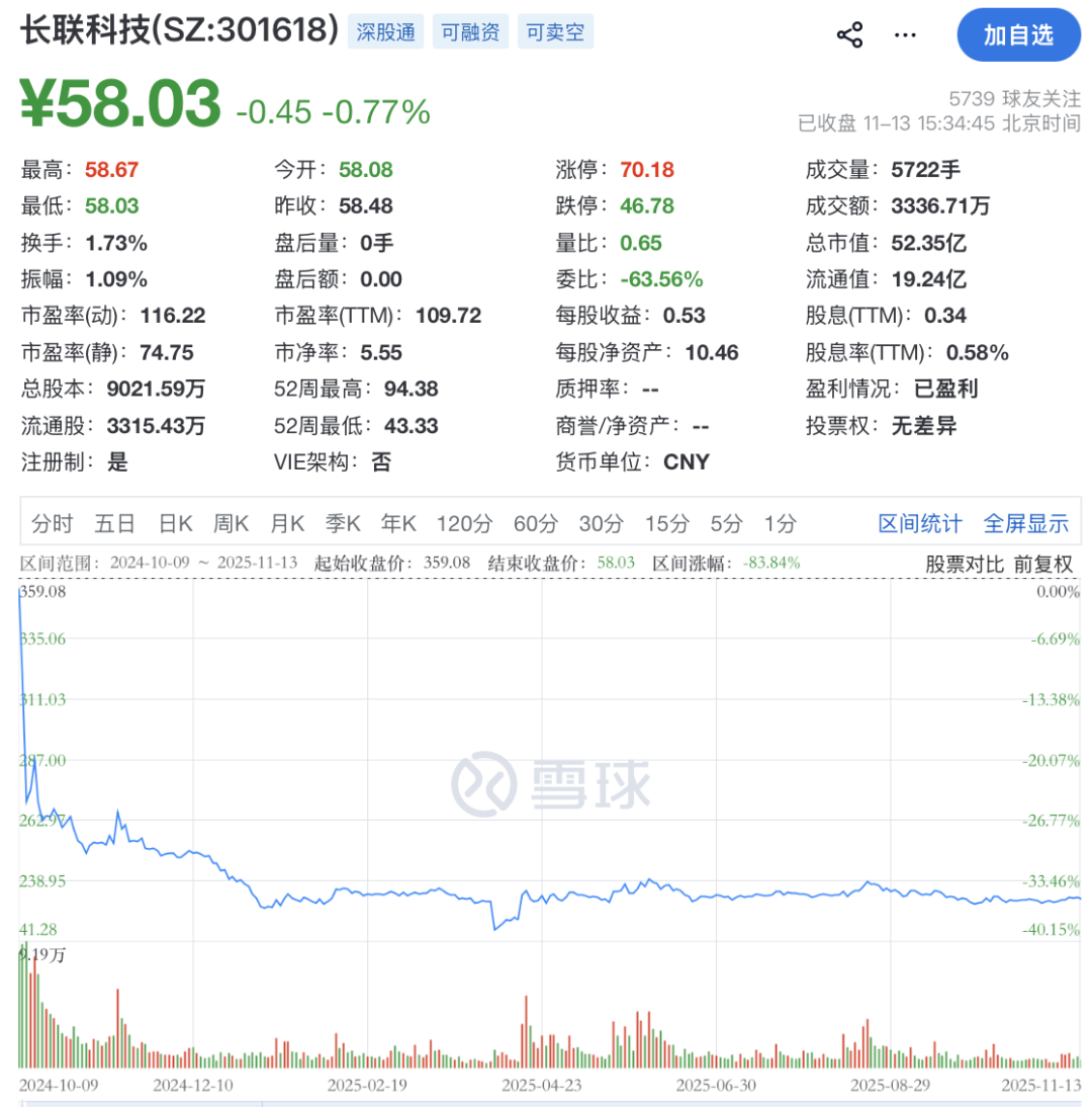 长联科技11月13日收盘价为58.03元/股,较去年10月9日已跌超83%。