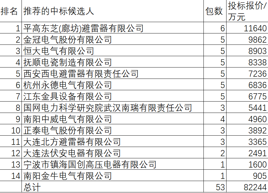 国网2025前5避雷器共招53包82244万元,由14家供应商提供。