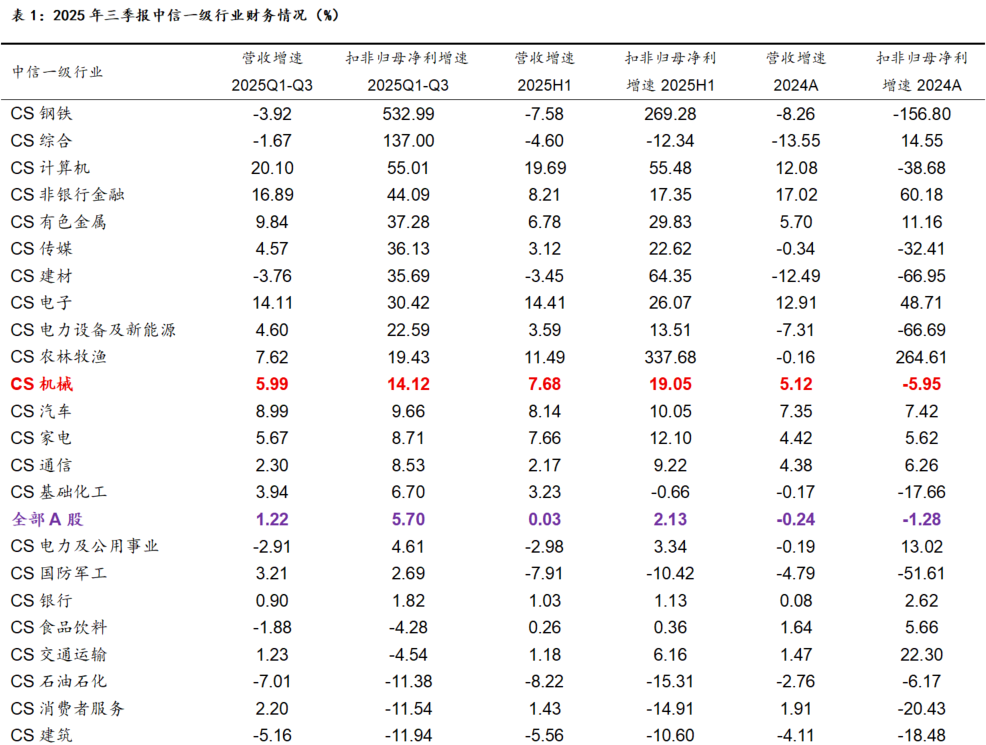 1.1. 中信机械行业2025年三季报业绩稳健增长,增速环比明显加速