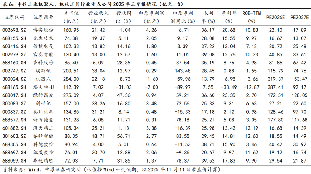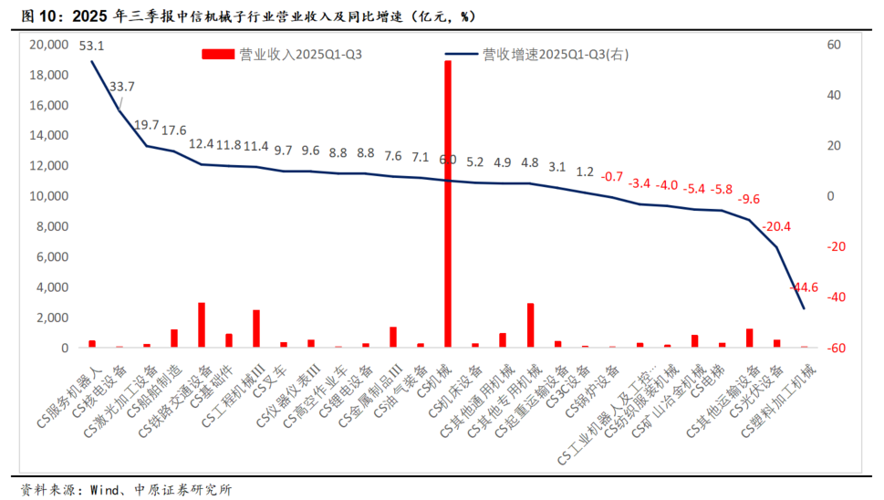 2025年三季报中信机械子行业营业收入增速:服务机器人(+53.1%)、锂电设备(+33.7%)、激光加工设备(+19.7%)、船舶制造(+17.6%)营业收入增速超过15%。