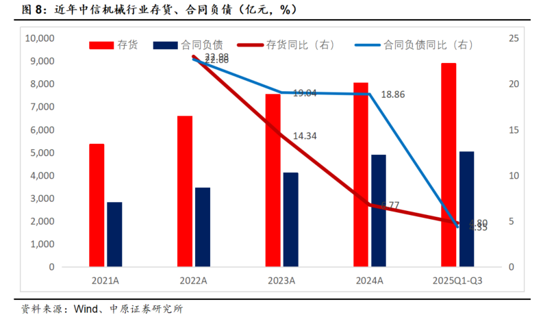 1.4. 中信机械行业2025年三季报存货、合同负债稳健增长,增速下滑