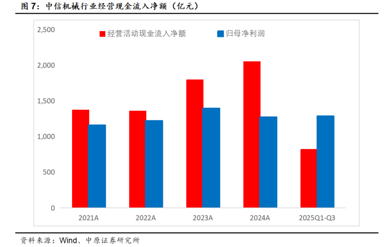 2025年三季报中信机械行业经营现金流入净额为822.6亿,同比增长27.27%,表明行业经营稳健,回款较好,现金流改善。