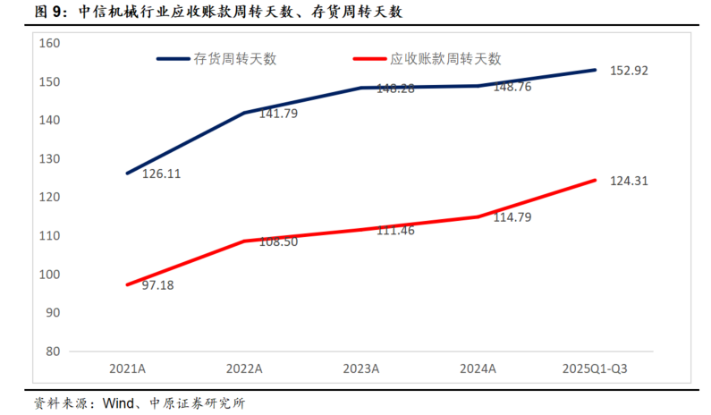 2025年三季报中信机械行业存货周转天数152.92天,应收账款周转天数124.31,周转速度有小幅放缓。