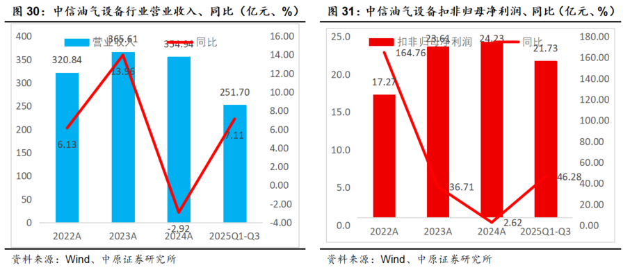 2025年三季报中信油气设备实现营业收入271.55亿,同比增长7.11%,实现扣非归母净利润21.73亿,同比增长46.28%。2025年油气设备行业迎来弱复苏,行业盈利能力也向好。2025年三季报扣非归母净利润大幅增长46.28%,在机械所有子行业里排前列。