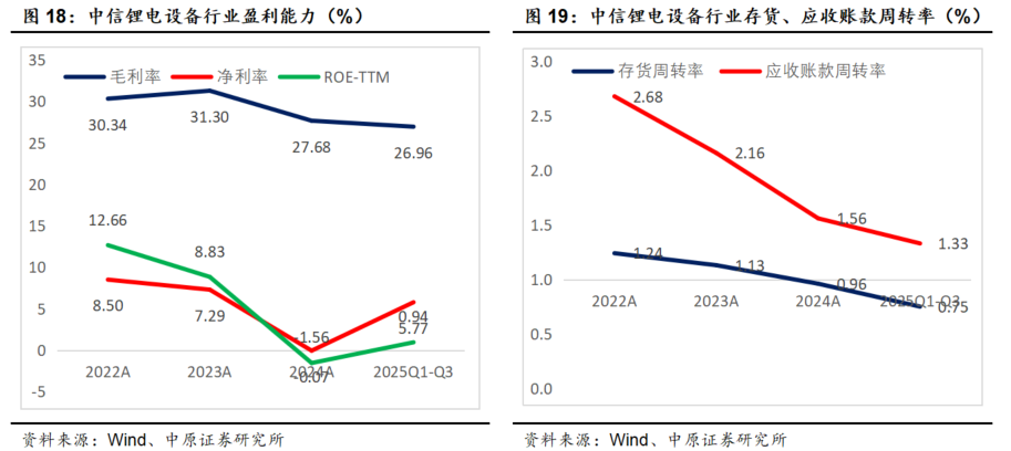 存货、应收账款周转率:2025年三季报,中信锂电设备行业存货周转率0.75,应收账款周转率1.33,对比去年三季报周转率分别小幅提升0.07、0.23,反映行业周转速度加快。