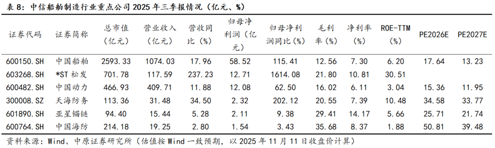 从三季度财报看,除个别企业外,中信船舶制造重点企业普遍实现了业绩快速增长,各项盈利指标也在相对改善。估值角度看,部分船舶制造企业2026年估值水平已经达到20倍以内,随着盈利能力逐步修复,船舶制造上市公司估值仍将有吸引力。