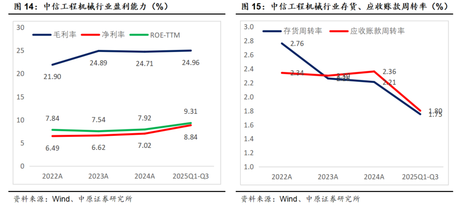 存货、应收账款周转率:2025年三季报,中信工程机械行业存货周转率1.75,应收账款周转率1.8,对比去年三季报周转率分别小幅提升0.11、0.11,反映行业周转速度小幅加快。