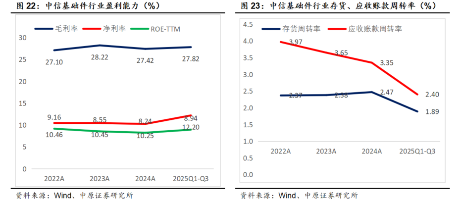 存货、应收账款周转率:2025年三季报,中信基础件行业存货周转率1.89,应收账款周转率2.4,对比去年三季报周转率波动较小。