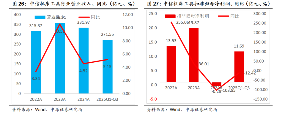 2025年三季报中信机床工具行业实现营业收入271.55亿,同比增长5.15%,实现扣非归母净利润11.69亿,同比下滑12.42%。金属切削机床产品产量持续复苏,但与工业机器人行业情况类似,行业竞争激烈,毛利率、净利率较低,盈利能力不佳。