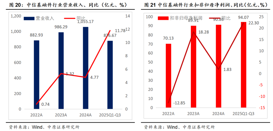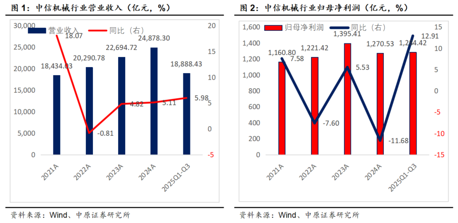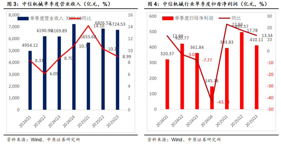 2025年三季报中信机械行业实现营业收入18888.43亿,同比增长5.98%,实现归母净利润1284.42亿,同比增长12.91%,实现扣非归母净利润1098.75亿,同比增长14.12%,营收增速保持稳健增长,归母净利润增速环比加速。