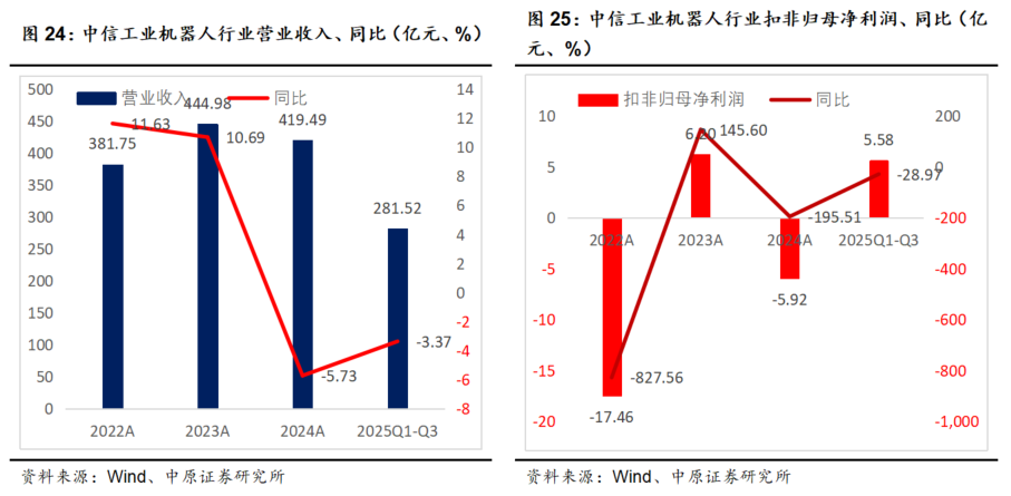 2025年三季报中信工业机器人及工控系统行业实现营业收入281.52亿,同比下滑3.37%,实现扣非归母净利润5.58亿,同比下滑28.97%。工业机器人产品产量从2024年开始持续转正增长,今年以来工业机器人产量增速一直维持在20%以上较高增速水平,产品产量持续复苏,但行业竞争激烈,毛利率、净利率较低,盈利能力不佳。2025年三季报中信工业机器人行业仍然表现不佳。