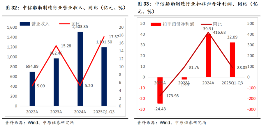 2025年三季报中信船舶制造行业实现营业收入1191.5亿,同比增长17.57%,实现扣非归母净利润32.09亿,同比增长88.5%。2025年虽然新接订单出现阶段性调整,但船舶行业新造船价格指数仍然在高位震荡,造船完工量稳健增长,在手订单仍然以较快速度增长,船舶行业景气度仍然持续,船舶制造企业盈利修复加速。三季报,中国船舶和中国重工合并后首份财报也取得了较好的成绩。