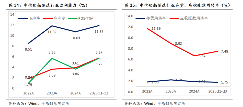 存货、应收账款周转率:2025年三季报,中信船舶制造行业存货周转率1.75,应收账款周转率上升到7.48,对比去年三季报分别上升0.5、3.35。船舶制造企业存货、应收账款周转速度明显加快。