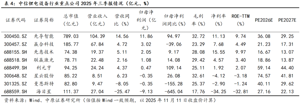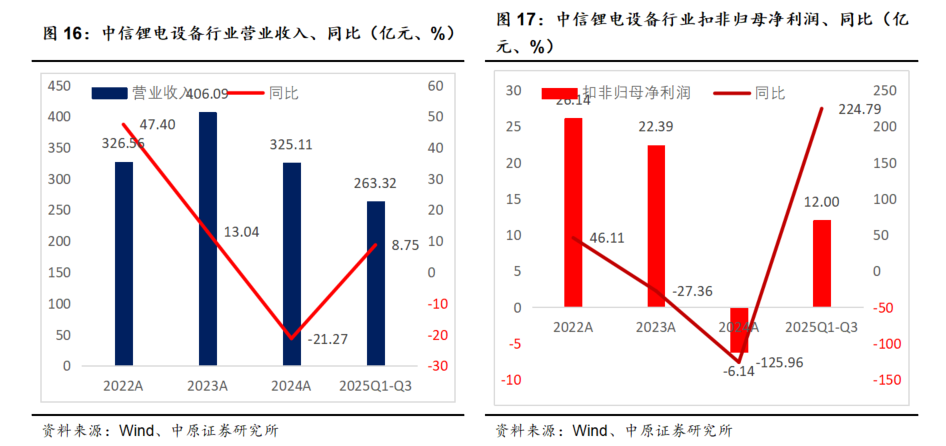 2025年三季报中信锂电设备行业实现营业收入263.32亿,同比增长8.75%,实现扣非归母净利润12亿,同比大幅扭亏为盈。营业收入增速、扣非归母净利润增速都迎来底部反转,反映了锂电设备行业触底反弹,经营形势变好,企业盈利逐步改善。