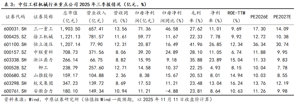 从三季度财报看,工程机械企业普遍实现了较好的业绩增长,各项盈利指标也在相对改善。三一重工、中联重科等龙头企业业绩增速领先行业。工程机械企业2025年三季报的良好表现,和行业基本面基本吻合。目前主要龙头企业2026年估值都回到了10-15倍之间,行业复苏持续,龙头公司盈利继续修复,估值水平具有吸引力。