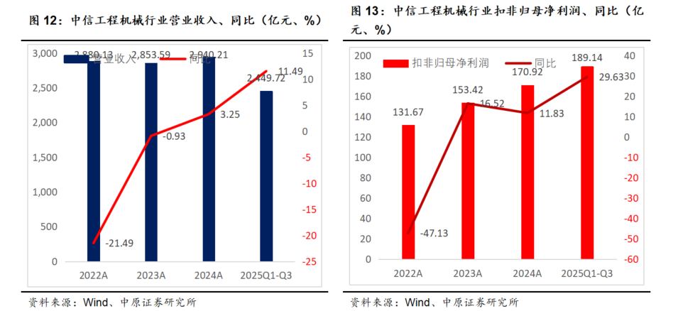 2025年三季报中信工程机械行业实现营业收入2449.72亿,同比增长11.49%,实现扣非归母净利润189.14亿,同比增长29.63%。营业收入增速、扣非归母净利润增速都环比有明显上升,反映了工程机械行业经营形势变好,企业盈利情况持续改善。