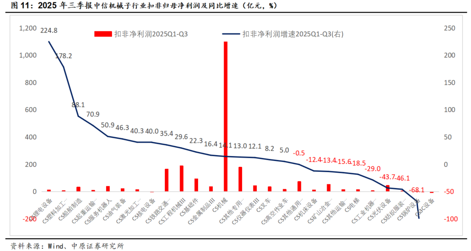 2025年三季报中信机械子行业扣非归母净利润增速:锂电设备、船舶增长、起重运输设备、服务机器人等子行业增速超过50%,油气设备、激光加工设备、核电设备、铁路设备、工程机械、基础件等子行业扣非净利润增速也超过了20%。