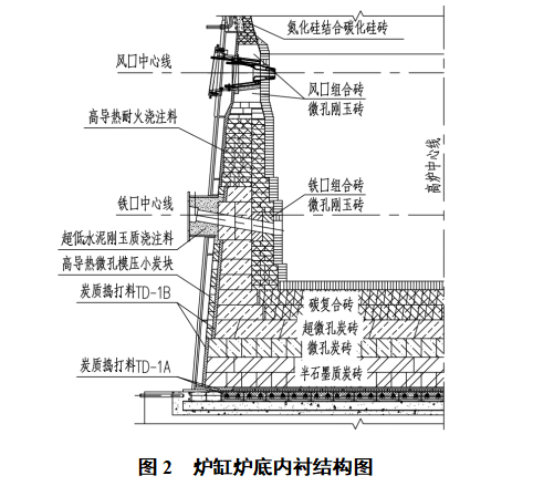 高炉内衬能否适应高炉冶炼对炉衬的破损,对高炉长寿至关重要。设计中针对各部位的破损机理合理选择冷却设备和炉衬结构形式是至关重要的。采用砖壁合一、薄内衬结构符合“渣皮就是最好内衬”这一长寿理念,设计炉型即操作炉型,炉型稳定,有利于煤气流均匀分布和操作顺行,同时节省大量耐材和缩短施工周期。