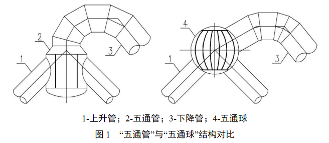 炉顶粗煤气系统采用“五通管”代替“五通球”结构(图1),能有效减少焊缝数量和施工难度,“五通管”筒体纵向焊缝一般为4条,“五通球”赤道带纵向焊缝一般为12条。