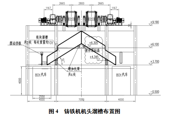 该铸铁系统每天铸铁量为5000t左右,为提高生铁块的转运效率,在铸铁机机头设置生铁块溜槽(图4),使生铁块直接落进载重汽车车厢,再在生铁块堆场对超载部分生铁块进行二次倒运,剩余部分可直接外发,实现了生铁块的“直运”模式。