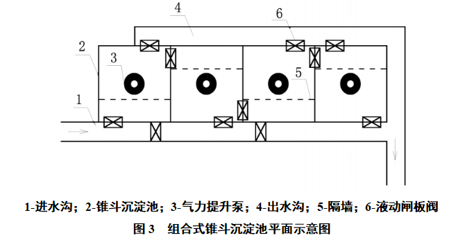 组合式锥斗沉淀池能较好的实现细渣沉淀分离,沉淀后的冲渣水含渣量<300mg/L。组合式锥斗沉淀池可实现多个沉淀池的串联、并联切换或实现单个锥斗沉淀池的离线清理或维修,沉淀池入口处设置隔墙能提高细渣分离效率[1]。