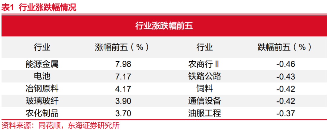 上交易日同花顺行业板块中,能源金属板块大涨7.03%,涨幅第一,电池板块,大涨5.79%,涨幅第二,两指数均创波段新高,目前尚无明显拉升结束迹象。其次,其他电源设备、贵金属、小金属、工业金属、化学原料、农化制品等板块收涨居前。只有四个板块小幅震荡收阴,分别是油气开采加工、公路铁路运输、银行、黑色家电板块。电池、能源金属、半导体、工业金属、化学制品、专用设备等板块大单资金净流入居前,而其他电子、电力、建筑装饰、医疗器械等板块大单资金净流出居前。