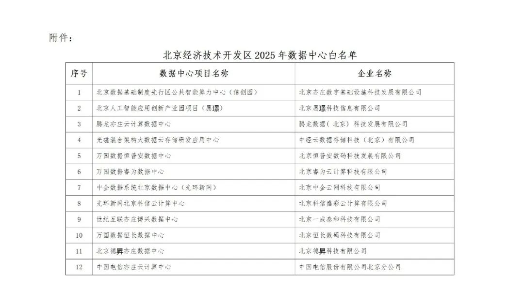 近日,北京经济技术开发区(简称“经开区”)管委会官网正式发布《关于公布北京经济技术开发区2025年数据中心白名单的通知》(以下简称“《通知》”)。