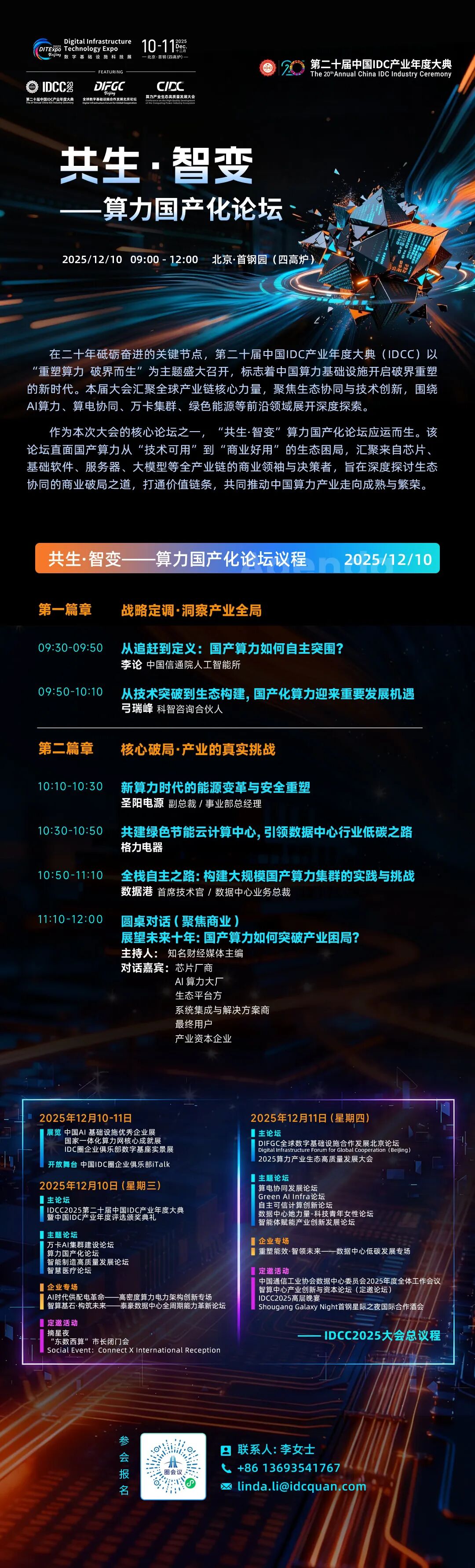 为了深入探讨算力国产化面临的生态共建挑战与未来发展路径,“共生·智变”算力国产化论坛将于2025年12月10日在首钢园第高炉盛大举行。该论坛作为第二十届中国IDC产业年度大典(IDCC)的核心分论坛,由中国IDC产业年度大典组委会主办,人工智能软硬件协同创新与适配验证中心、中国 IDC 圈承办,本论坛将汇聚来自芯片、基础软件、服务器、大模型等全产业链的商业领袖与决策者,直面产业真问题,共商生态破局之道。