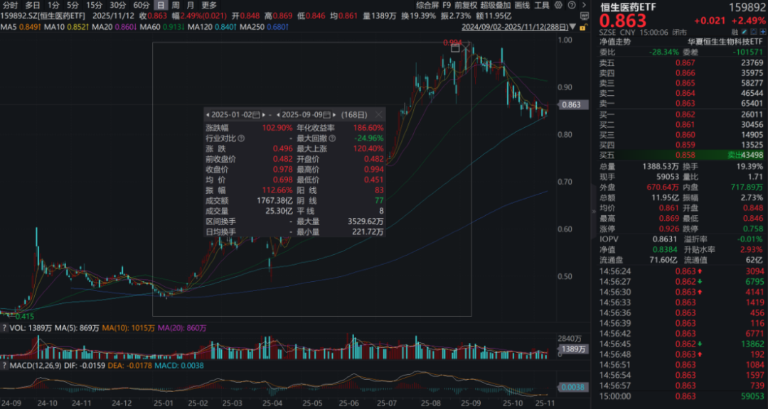 那对于我们专业机构来说依然要面临紧密跟踪仍会有一些公司业绩超预期或miss的情况,因此行业ETF投资在多数情况下还是大家最好的选择,我们讲了两年的恒生医药ETF(159892),今年来最大涨幅是103%,期间有两次回调幅度超过10%,分别是4月7日那次贸易战回调了18%和近期高位回调至今最大跌幅也没超过15%。