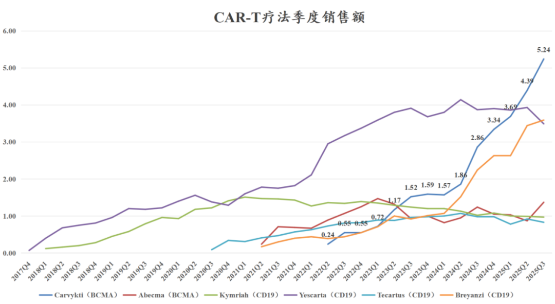 Carvykti在25年三季度销售5.24亿美元同比增长83%、环比增长19.4%,其中美国区收入3.96亿美元同比增长53.49%,美国区收入增长放缓比较多,收入占比下降到75.57%;欧洲、日本及其他市场收入1.28亿美元同比增长374%,增速还有所加速,收入占比从上个季度的18%提升到三季度的24%。