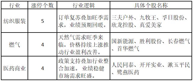 从行业特征来看,今日涨停板个股中,纺织服装、燃气、医药商业行业的个股最多。