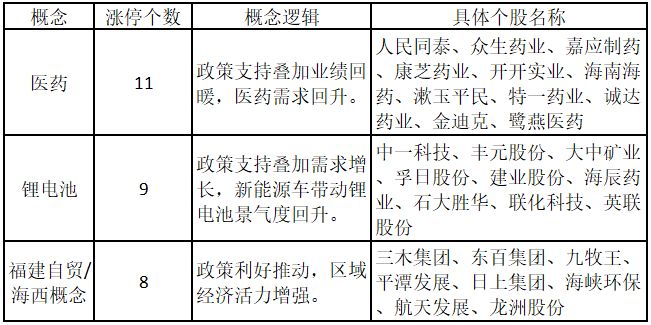 从概念特征来看,今日涨停板个股中,医药、锂电池、福建自贸/海西概念的个股最多。