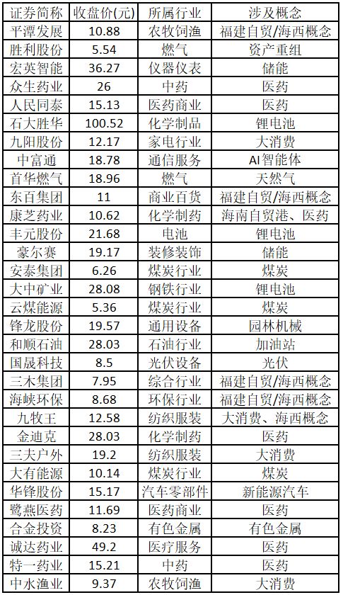 涨停板个股中,股价创出近一年新高的个股有31只(不包括创出历史新高的个股),包括平潭发展、胜利股份、宏英智能、众生药业、人民同泰、石大胜华、九阳股份、中富通、首华燃气、东百集团、康芝药业、丰元股份、豪尔赛、安泰集团、大中矿业、云煤能源、锋龙股份、和顺石油、国晟科技、三木集团、海峡环保、九牧王、金迪克、三夫户外、大有能源、华锋股份、鹭燕医药、合金投资、诚达药业、特一药业、中水渔业,具体如下表所示。