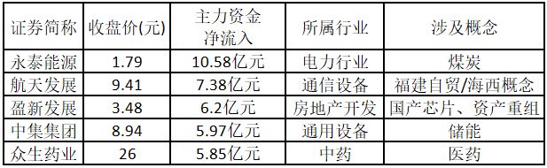 从主力资金来看,今日涨停板个股中,主力资金净流入金额排名前5的个股分别为永泰能源、航天发展、盈新发展、中集集团、众生药业。