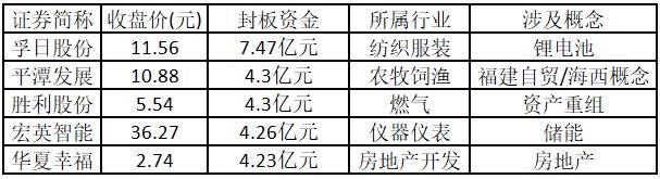 从封板资金来看,今日涨停板个股中,封板资金排名前5的个股包括孚日股份、平潭发展、胜利股份、宏英智能、华夏幸福。