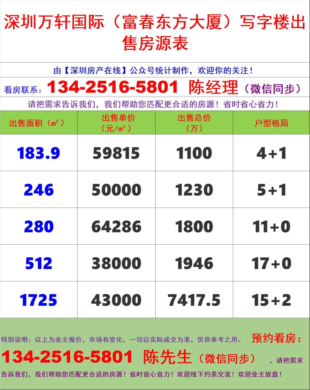 特别说明: 市场有变化,以上房源数据仅供参考之用,一切以实际成交数据为准,预约看房敬请联系:【深圳房产在线】陈经理团队:134-2516-5801(微信同步)
