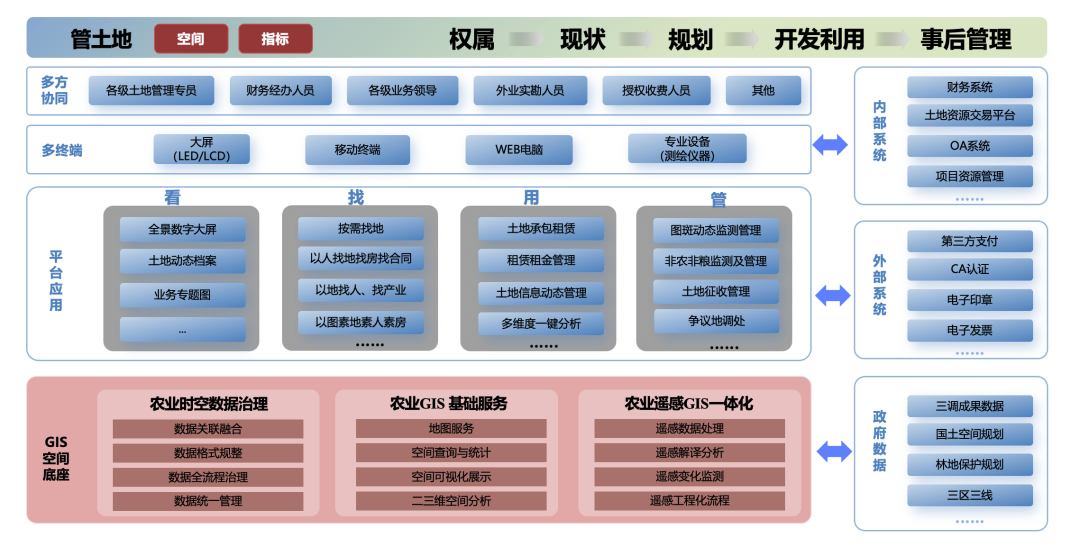 近日,超图软件联合海南金垦赛博信息科技有限公司(以下简称“金垦赛博”)正式发布基于GIS空间底座的农业综合解决方案(以下简称“方案”),以土地全生命周期管理为核心,整合GIS、人工智能、遥感及无人机等多源技术,构建起集数据采集、智能分析、业务处理与风险监控于一体的数字化平台,形成“一图统管、智能预警、科学决策”的新型治理体系。
