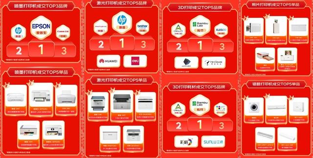 品牌和单品层面,喷墨打印机成交TOP3品牌分别为爱普生、惠普、佳能,爱普生(EPSON)墨仓氏 L3251家用打印机成为喷墨打印机成交TOP1单品;激光打印机成交TOP5品牌分别为惠普、奔图、兄弟、华为、得力,惠普(HP)116w 激光打印机成为销量最高的激光打印机单品。3D打印成交TOP5品牌分别为拓竹、创想三维、爱乐酷、ANYCUBIC、黑格科技;3D打印耗材成交TOP5品牌分别为拓竹、创想三维、CMYKSUPPLIES、彩格、SUNLU三绿。照片打印机成交TOP5单品中,小米独占前三名,小米(MI)米家口袋照片打印机 Pro成交量最高;错题打印机单品中,爱立熊 P90家用A4错题打印机成交量最高。打印机成交TOP10 pop店铺榜单中,惠普打印机旗舰店、得力打印机旗舰店、爱普生打印机旗舰店摘得前三桂冠。在耗材方面,3D打印耗材销售额TOP3品牌为惠普、格之格、绘威。